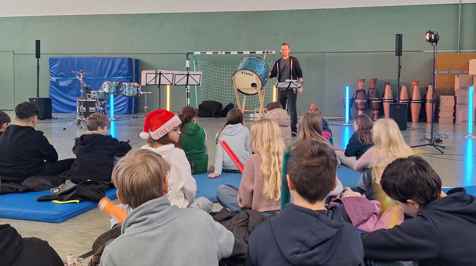 In der letzten Schulwoche vor den Weihnachtsferien konnte nun schon ein spezifisches Angebot genutzt werden. Um den Teamgeist und Zusammenhalt unserer heterogenen Schülerschaft zu stärken, wurde ein dreitägiger Trommelkurs beim „Musikwerk Erfurt“ gebucht. Musik funktioniert ohne Sprache, und Schlaginstrumente sind leicht zu bedienen, auch ohne Kenntnis von Noten. Die drei Workshopleiter brachten jede Menge musikalische Ideen, mehrere Kisten voller Schlaginstrumente und auch gute Nerven mit. Denn es wurde richtig laut in unserer Turnhalle.